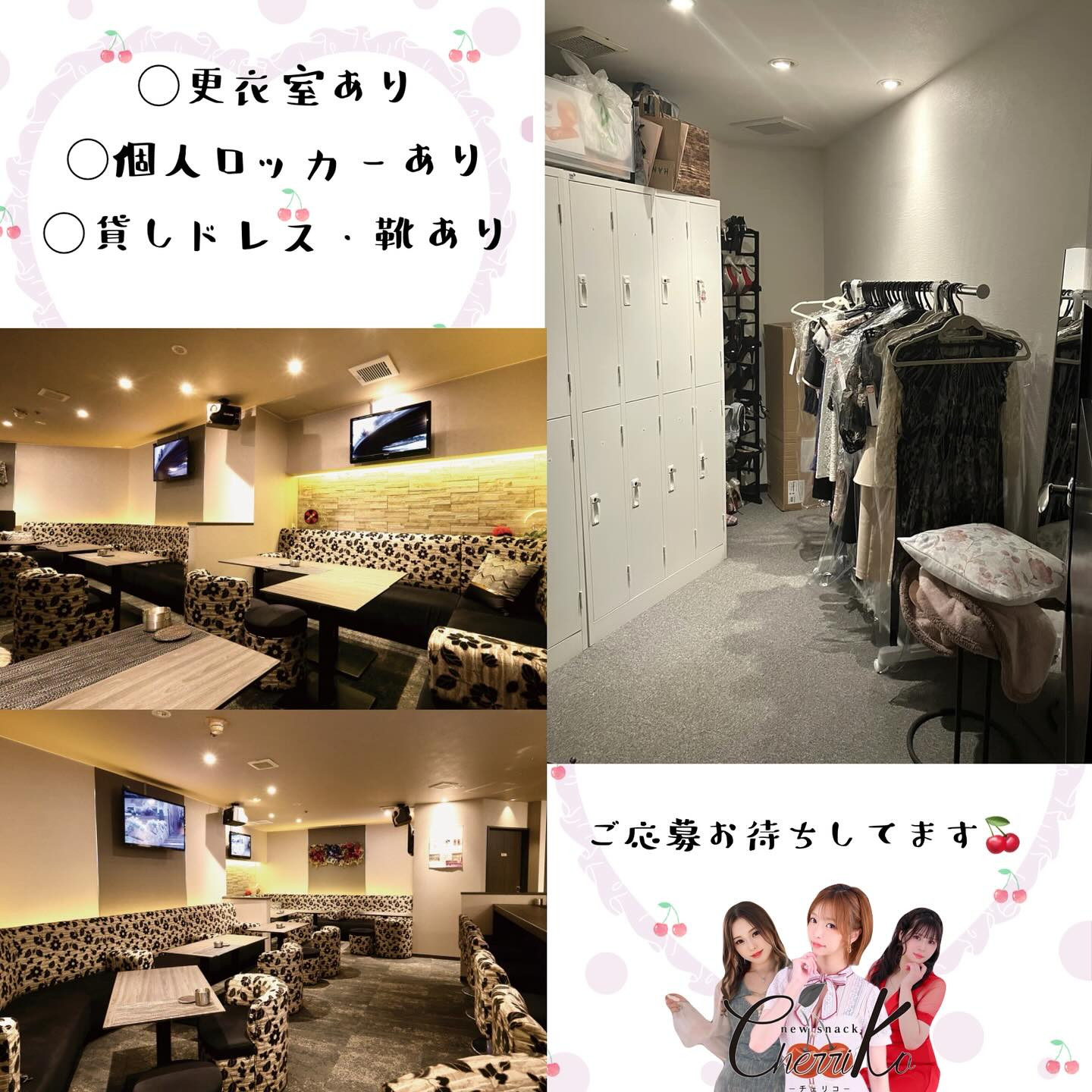 ノルマなし・貸しドレス、靴、ハンカチあり・更衣室、鍵付きロッカー完備でとても働きやすい環境です !!