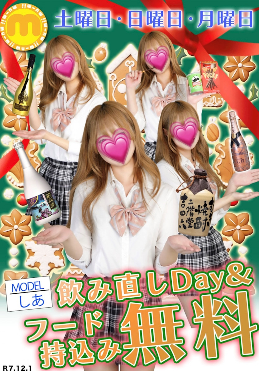 全員が入店から3ヶ月で卒業!! 『18~22歳までのJK制服キャバクラ』 mu-mii神田店 本日12月25日(木) 〜営業時間〜 18:00〜25:00 出勤24名 全員素人娘で右も左もわからないmu-mii girlですので お客様の優しいお心で沢山愛してあげてくださいませ!! 神田キャバクラ【mu-mii(ムーミー)】東京JK制服ラウンジ公式HP https://mu-mii.jp/ ※キャスト出勤やイベント情報、メール会員様の料金、 女子大生のプライベートブログなどなど、、情報が超満載♪ ~~~イベント情報~~~ ムーミークリスマスNight最終日♪ シャンパンフェア& キープボトルフェア♪ 【LINE会員様大募集!!】 【mu-mii LINE公式アカウント】 お友達追加をすると、、 ・毎日SET料金が超割引き!+無料飲み放題付き! ・出勤情報 ・イベント情報 ・入店速報 などなど、、 最新情報をGET!! お友達追加宜しくお願い致します♪ ↓下記リンクからお友達追加をするだけでOKです♪ ~~~~本日の出勤~~~~ なぎ ムーミー かんな ムーミー ひな ムーミー ぱるる ムーミー しあ ムーミー くるみ ムーミー るな ムーミー まお ムーミー なみ ムーミー きあら ムーミー もも ムーミー ゆみ ムーミー りの ムーミー ちなつ ムーミー さら ムーミー mu-miiスタッフ あらまき ムーミー 神田mu-mii(ムーミー)店 〒101-0047 東京都千代田区内神田3-8-8 SKビルB1F Google Map 電話:03-6260-9071 神田キャバクラ【ムーミー(mu-mii)】 東京JK制服ラウンジ公式HP https://mu-mii.jp/